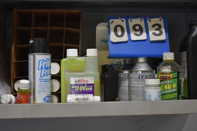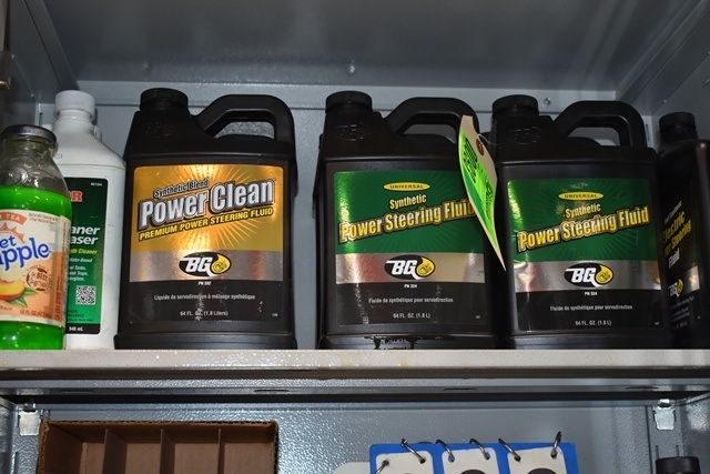 Cabinet Contents Consisting of BG Power Clean, BG Synthetic Power Steering Fluid, BMW Compressor Oil, etc.