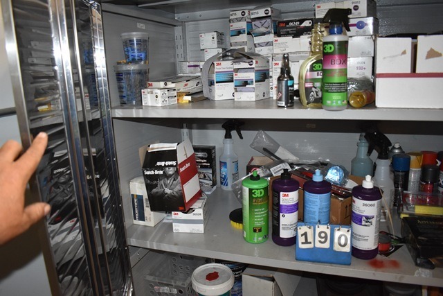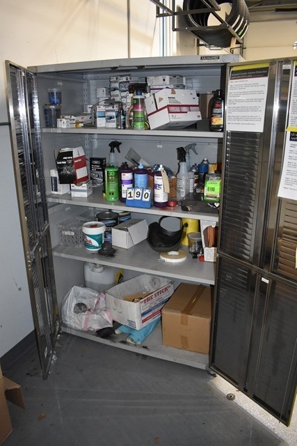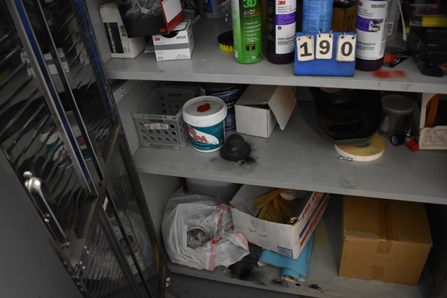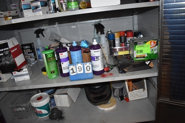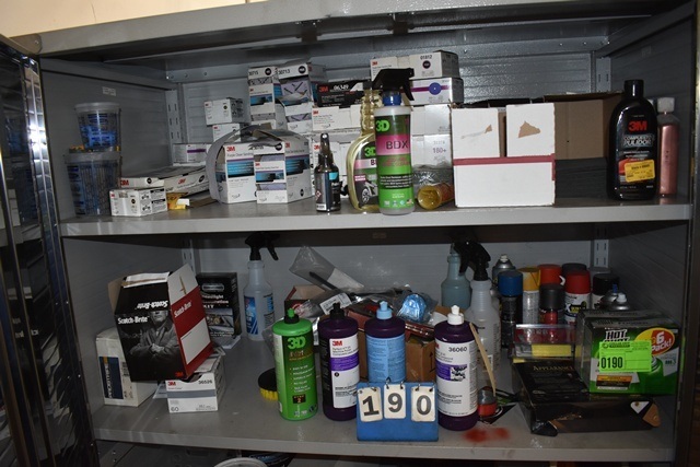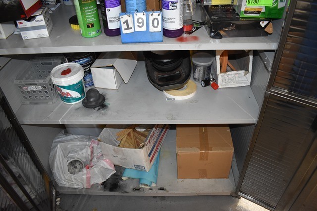 Cabinet Contents Consisting of Sandpaper, Buffing Compound, Scotch Bright Pads, Spray-paint, etc.