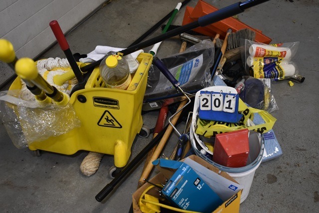 Large Lot of Cleaning Tools Including Mop Pale and Ringer, Scrub Brush, Painting Supplies, etc.