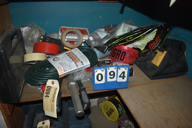 Shelf Lot Including Jackhammer Bit, Lead Cords, Red Caution Tape, etc.