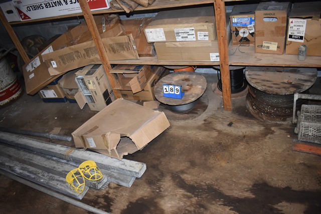 Shelving Unit Contents Including Glass Block, Steel Cable, Cable TV Wire, etc.