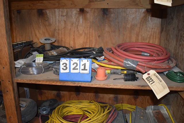 Shelf Lot of Assorted Pump Pieces, Short Lead Cords, Plastic Fittings, 12V Fuel Pump, Oil Filters, etc.
