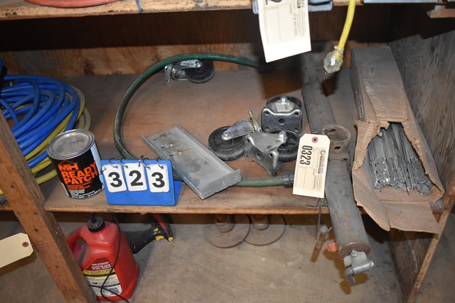 Shelf Lot of Assorted Hose, Bondo, Oils