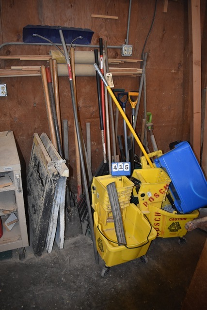 Large Lot Including Saw Horses, Mop Bucket and Wringer, Rakes, Shovels, etc.