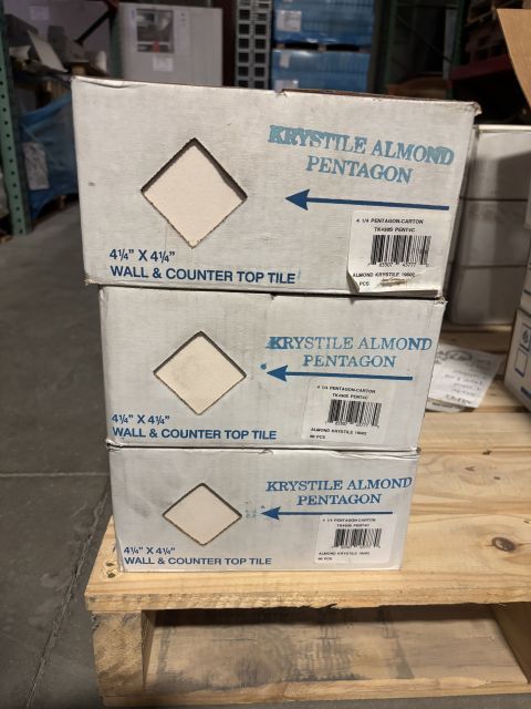 Tile, Huntington 4.24-inch clip-corner (pentagon) "Krystile Almond" (K430) wall tile; 96 pieces / 12 sq. ft.per carton; 3 cartons / 36 sq. ft. feet in total PLUS choice of 1x1 "Dot" color at time of post-sale pick up