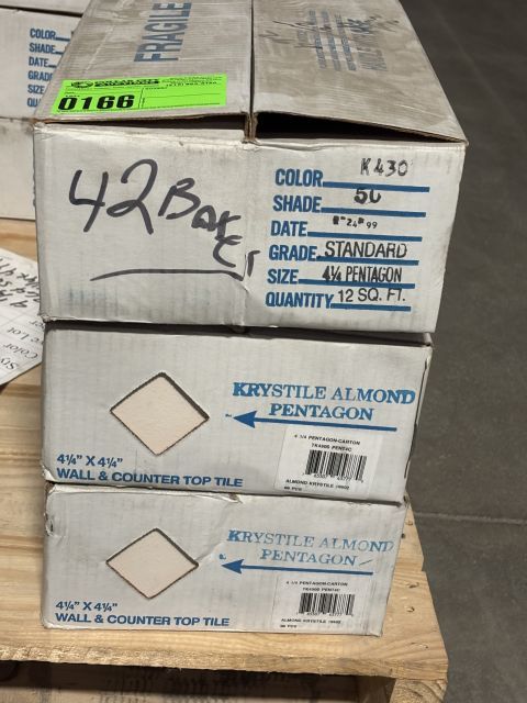 Tile, Huntington 4.24-inch clip-corner (pentagon) "Krystile Almond" (K430) wall tile; 96 pieces / 12 sq. ft.per carton; 2 cartons and 26 pieces / 24-plus sq. ft. feet in total PLUS choice of 1x1 "Dot" color at time of post-sale pick up
