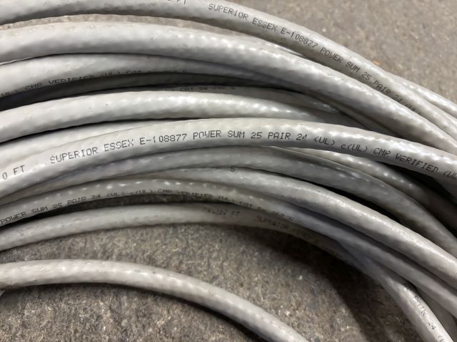 Superior Essex 24/25-Pair Power Sum CAT5e U/UTP Plenum Backbone Network Communications Cable; 148 feet long; features FEP-insulated color-coded solid bare copper twisted pairs with a center core separator. Made in the USA.