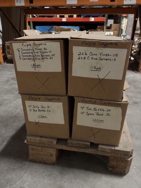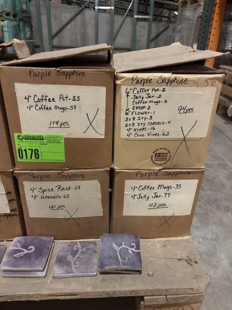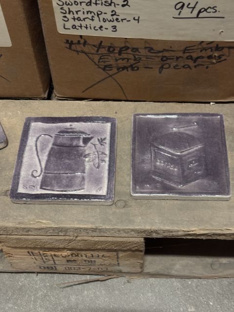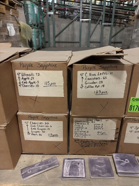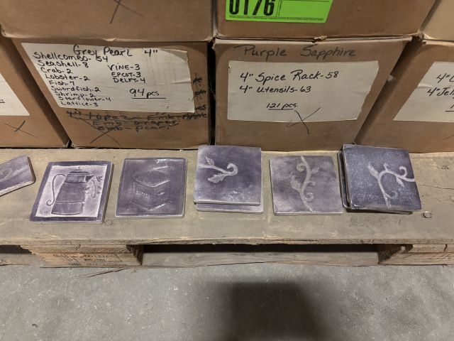 Decorative "Purple Sapphire" wall tile - several relieve styles, including coffee pots, utensils, swordfish, cherries, and more. Count of each style unconfirmed; all 12 cartons sold as a single lot