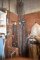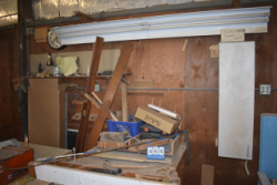 Back Wall Lot Consisting of Stainless Steel Frame, Wood, Cabinets, C-Clamps, etc.