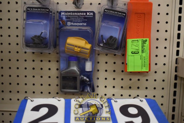 SHELF LOT OF BAR & CHAIN OIL CAPS, FELLING WEDGE, HUSQVARNA MAINTENANCE KIT FOR 445 & 450E