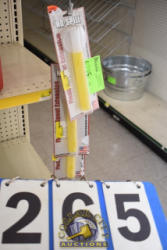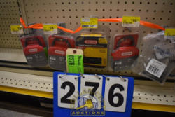 SHELF LOT CONSISTING OF BAR AND CHAIN OIL, VALVE STEM TOOL, REESE COUPLER LOCK, TRAILER BALL, WEDGES, POSTED SIGNED, HUSQVARNA SPLITTING WEDGES