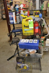 SHELF LOT CONSISTING OF BRAKE FLUID, NUTS, BOLTS, DRILL BITS, 8-TON HYDRAULIC JACK AND RACK