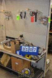 SHELVING UNIT WITH CONTENTS CONSISTING OF JACK STANDS, CHAINSAW BAR COVERS, PARTS BIN ORGANIZER, ELECTRIC PUMPS, LEAD CORDS