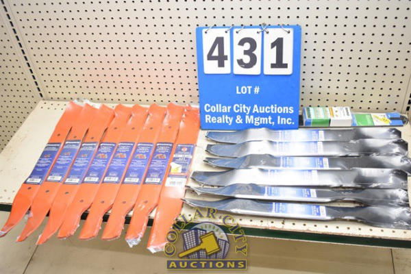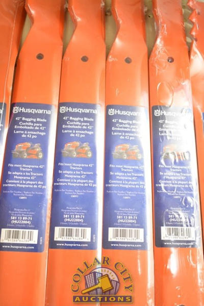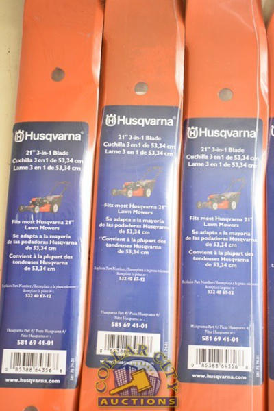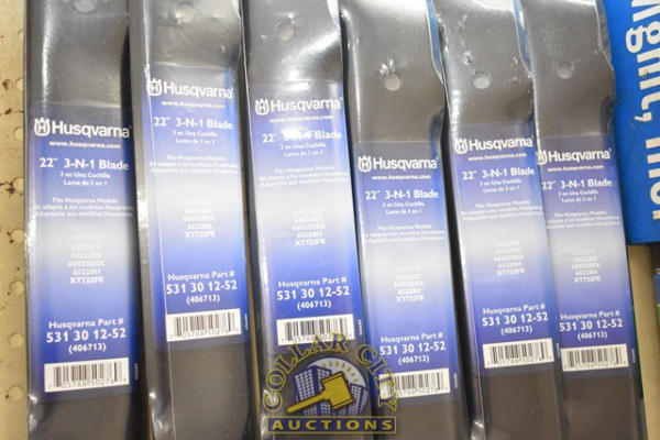 LOT OF ASSORTED HUSQVARNA MOWER AND DE-THATCHING BLADES