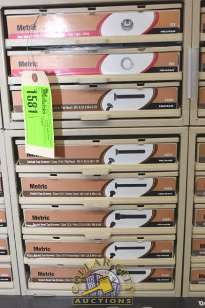 ORGANIZER BIN WITH CONTENTS CONSISTING OF METRIC NUTS, WASHERS, SOCKET CAP SCREWS, SOCKET HEAD CAP SCREWS