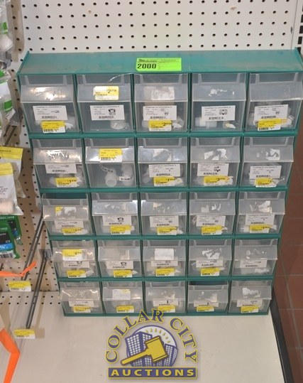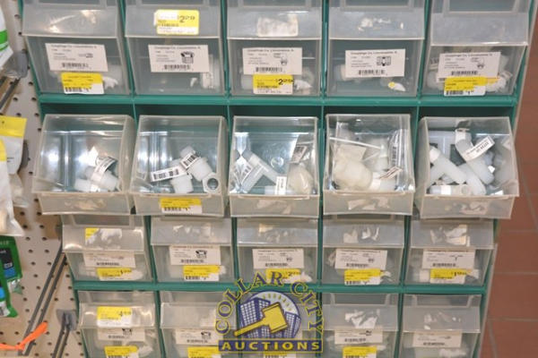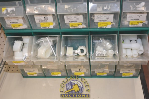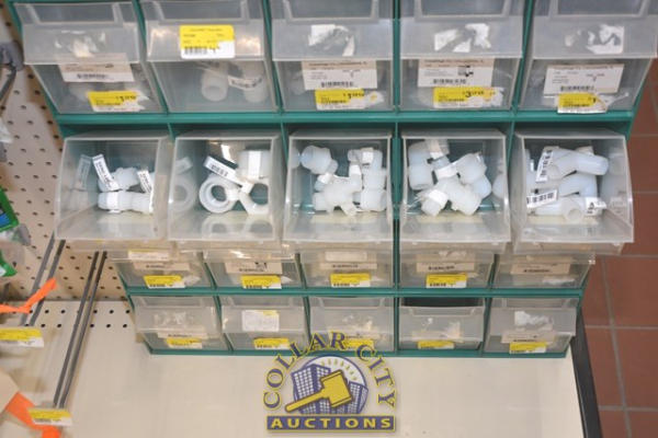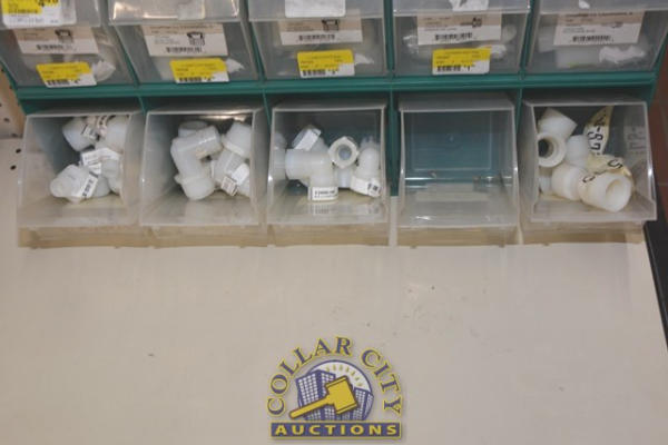 LOT CONSISTING OF PLASTIC COUPLINGS, BUSHINGS, INCLUDES THE 25-BIN ORGANIZER BIN, NYLON HOSE FITTINGS, ETC.