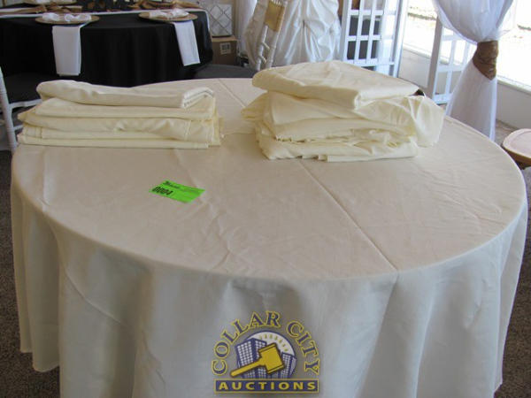 7 Round 90" ivory linens, 5 banquets 60x126 ivory linens (minor stains/imperfections)