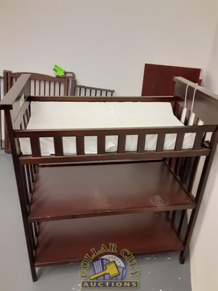 Dark wood changing table, gate and corner shelf.