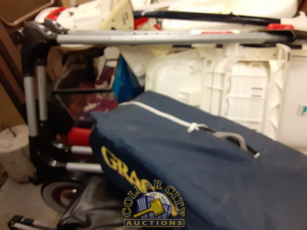 pallet of used baby items, 2 high chairs, 1 pack in play, green worm, Car, air hockey (all as is)