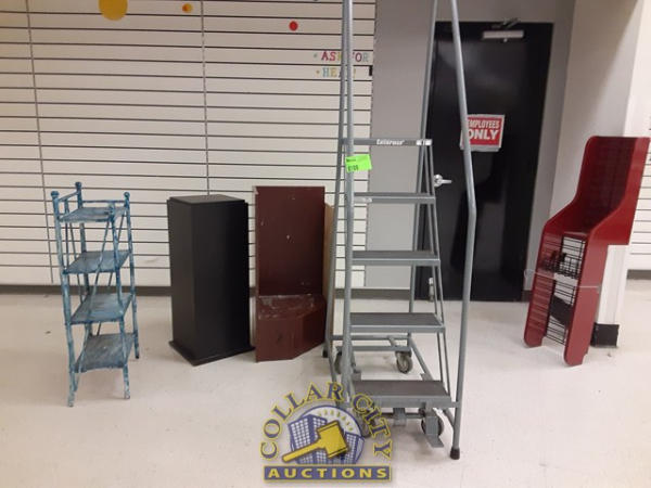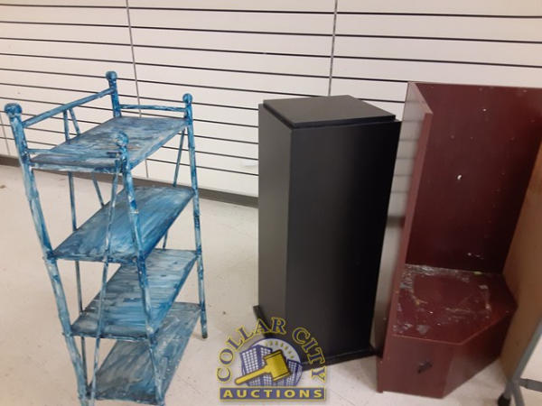 Lot of blue shelf, movable stair case/ladder, 1 slatwall shelf, 1 corner shelf, black stand.