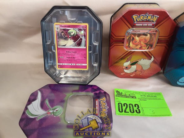 3 Pokémon tins with 1 card each in them