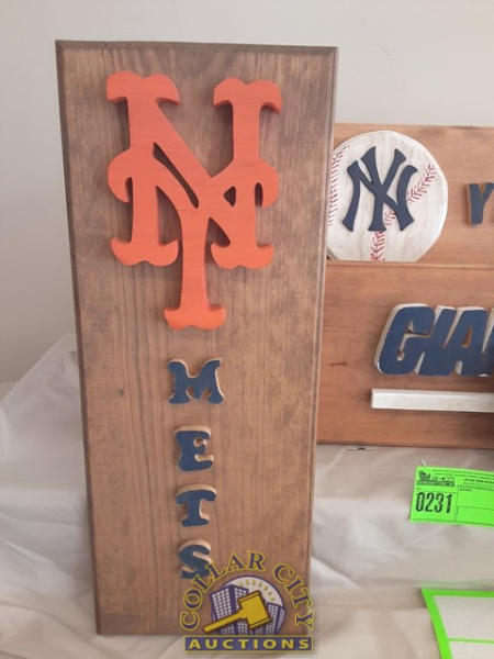 Hand made NY wooden signs, NY teams and Welcome sign.