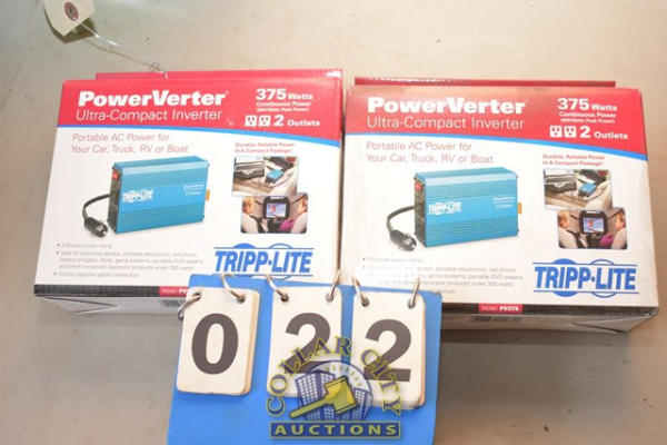 Lot of 2 Powerverter Ultra Compact Inverters, 375 watts continuous power, 600 watts peak power, with 2 outlets (We do not guarantee the working condition or completeness of any of these items.)