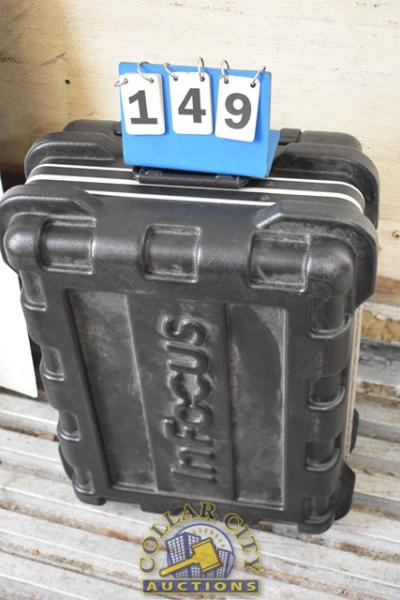 In Focus Camera Case on Wheels (no camera, has combination lock, combination is unknown), approx. 20" x 15" x 10" (We do not guarantee the working condition or completeness of any of these items.)
