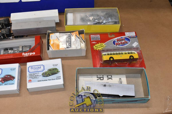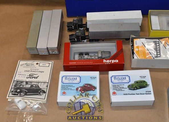 Lot of assorted Hollow Cast Resin Car Kits and a Herpa Miniature Truck Tractor and assorted Train Accessories