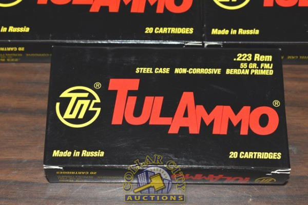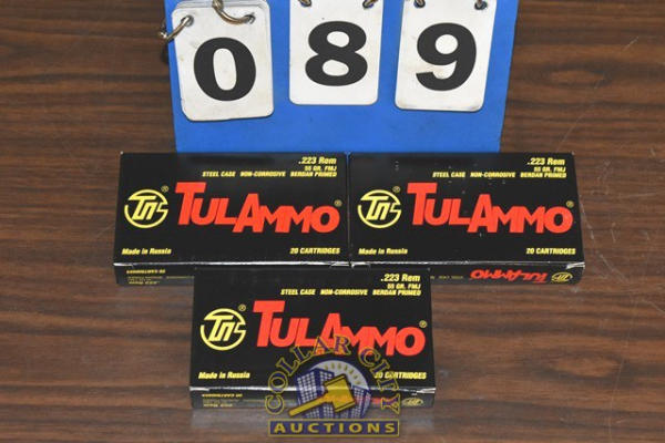 Lot of 3 boxes of Tulammo, Steel Cased, Non-corrosive, .223 Rem, 55 grain, FMJ (total of 60 cartridges)