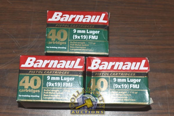 Lot of 3 boxes of Barnaul 9mm Luger, 9 x 19 FMJ (total of 120 cartridges)