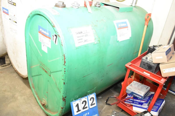 Approx. 275 gallon oil tank. Tank reading is 1/4 of a tank of 0/20 synthetic blend motor oil. DOES NOT INCLUDE THE PUMP. MUST PROVIDE CERTIFICATE OF INSURANCE.