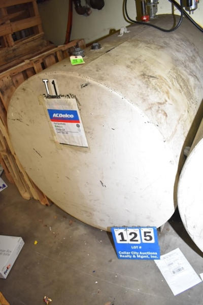 Approx. 500 gallon oil tank. Tank contains Full Synthetic 5W 30 motor oil and reads approx. 3/8. DOES NOT INCLUDE THE PUMP. MUST PROVIDE CERTIFICATE OF INSURANCE.