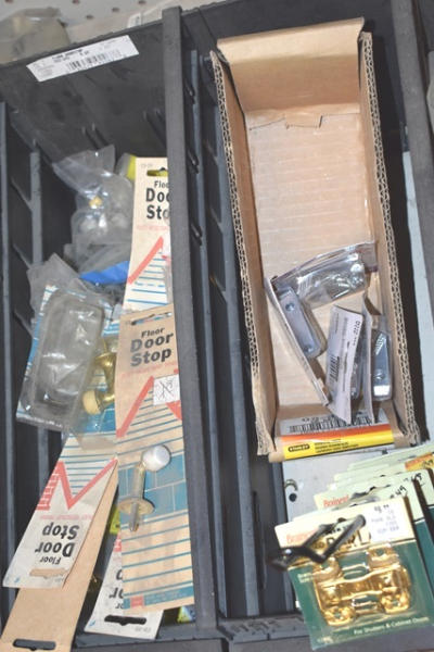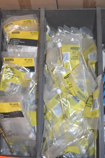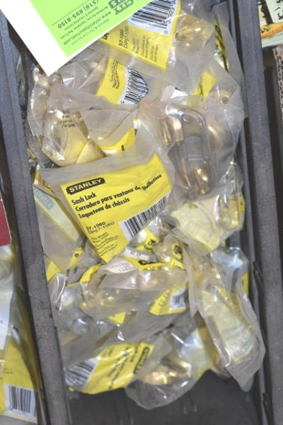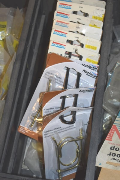 Lot of Stanley door stops, coat and hat hooks, sash locks