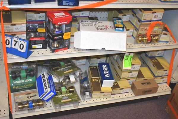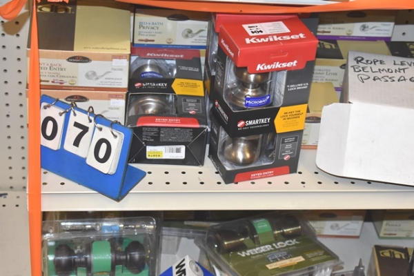 2 shelf lots of Design House door knobs, bed & bath privacy, Kwikset, Weiser, etc.
