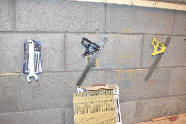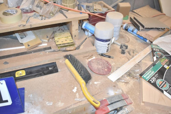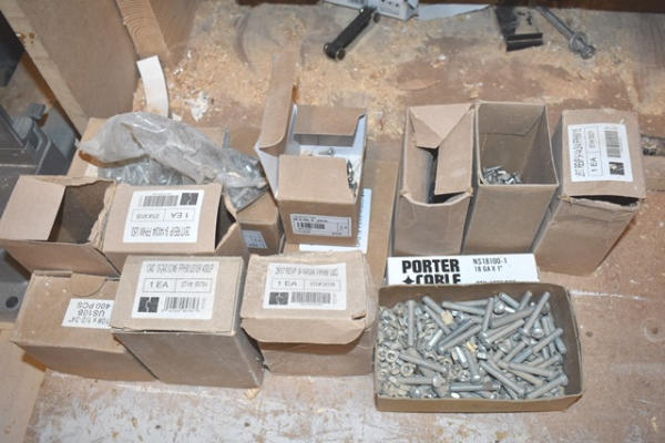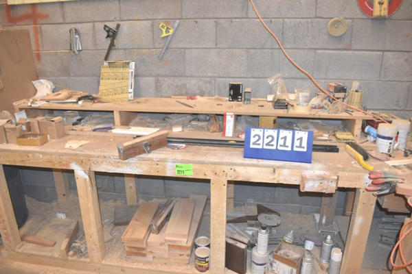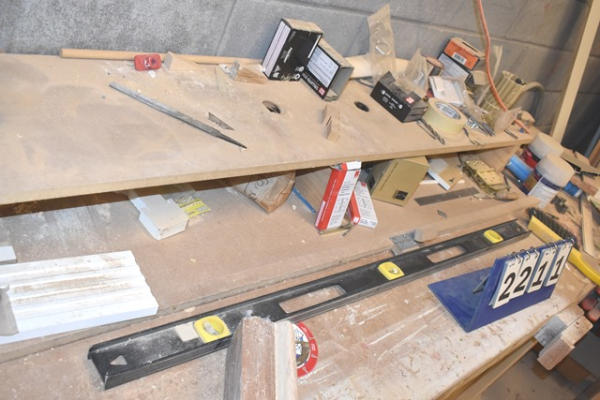Contents of work bench including hinges, nuts, bolts, staples, Bondo, etc.
