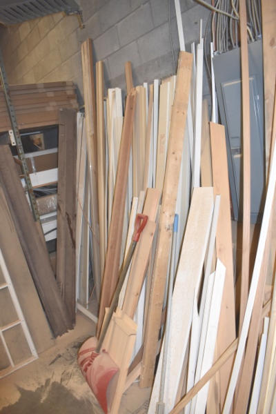 Lot of assorted door frame lumber, 2 x 4s, pine board, etc.