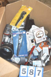Box lot of misc. wiring supplies including wiring nuts, plumbing supplies including feed lines, pex tube cutter