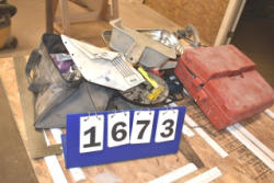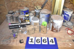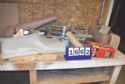 Work bench top contents consisting of staples, paint, stain, door knob parts, etc.