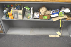 Under counter contents consisting of cleaning supplies, hats, small trash bags, etc.