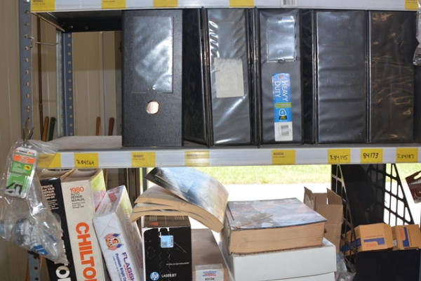 Rack lot consisting of binders, auto repair manuals, laser jet ink, etc.