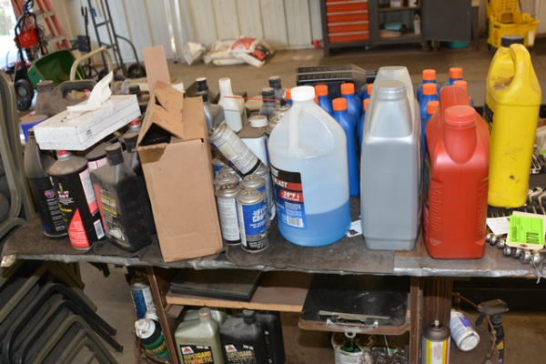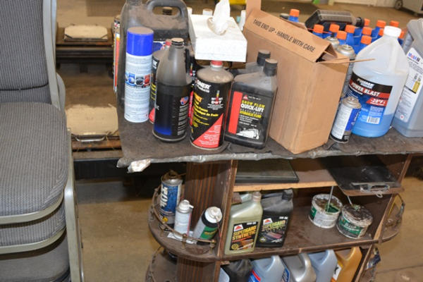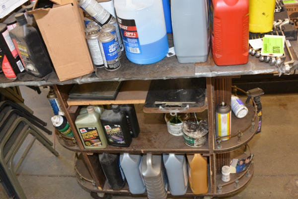 Cart on wheels consisting of assorted fluids including oil, hydraulic fluid, etc.