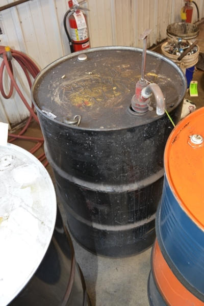 55-gallon drum - not completely full, comes with pump - contents unknown