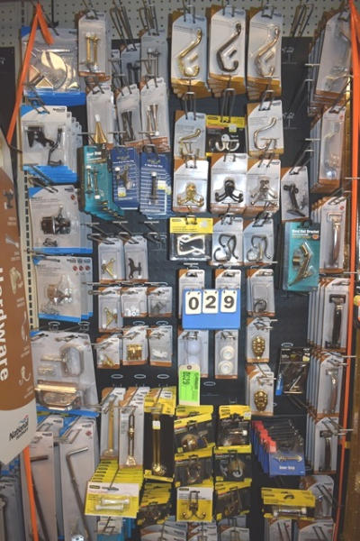 Pegboard lot of assorted coat hooks, latches, lid supports, door stops, etc.