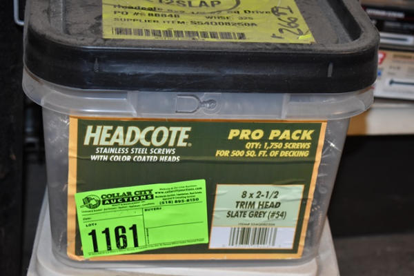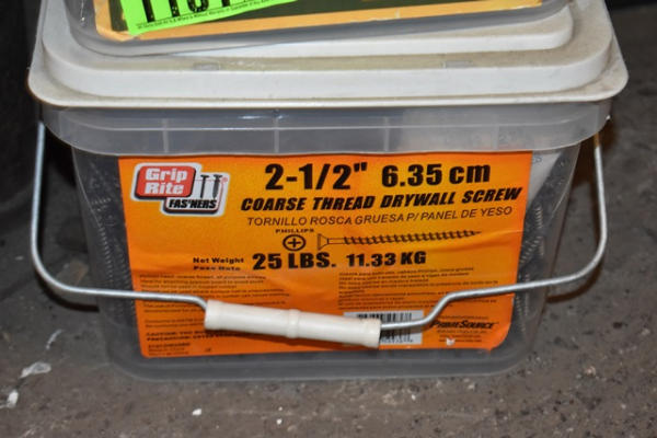 Pail of Headcote stainless steel screws and pail of 2 1/2" drywall screws