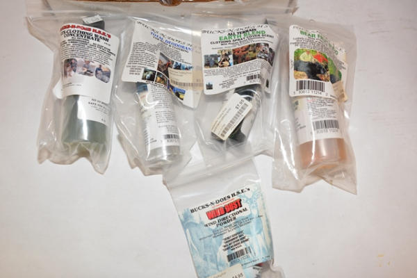 Lot of hunting scents including bear attractants, doe estrus, wind directional powder, GTX Clothing Wash Concentrates, etc.