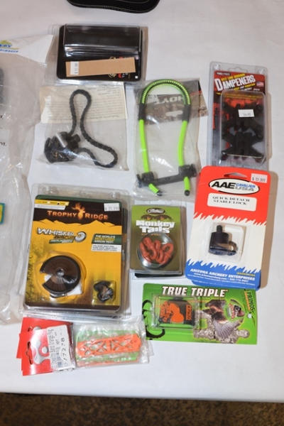 #57 – Lot includes a Bear Claw Quiver, universal, right or left hand, 7 1/2" of adjustment, accepts all broadheads, Team Hoyt Archery baseball cap, braided bow sling, Whisper Biscuit replacement biscuit, Quick Detach Stable Lock, True Triple Turkey Mouth Call, Hoyt Pro Hunter Deluxe Wrist Sling, etc.