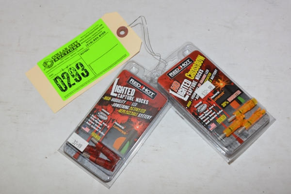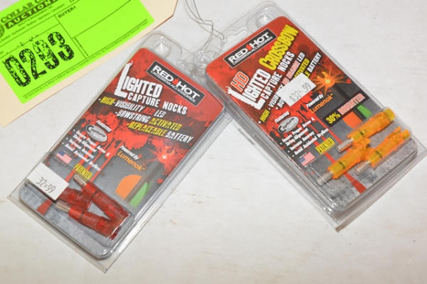 Lot of 2 sets of Red Hot Lighted Capture Nocks, high visibility LED, bow string activated, with replaceable battery, powered by Lumenok