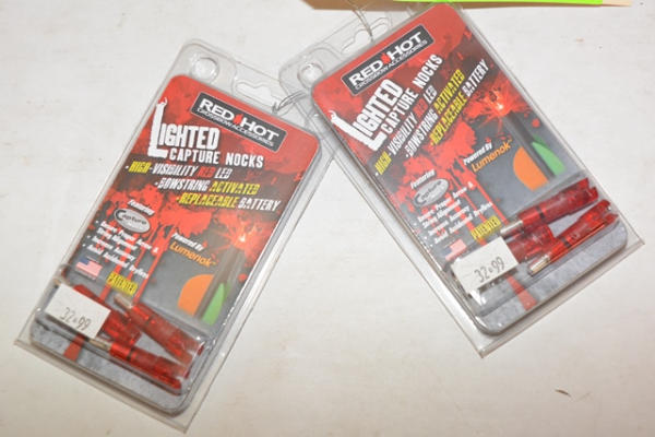 Lot of 2 sets of Red Hot Lighted Capture Nocks, high visibility LED, bow string activated, with replaceable battery, powered by Lumenok