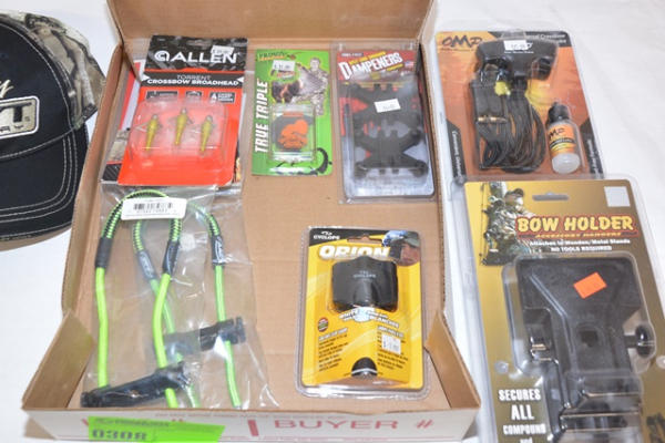 Lot includes bow holder, accessory hanger, Orien LED hat clip light, Hoyt Pro Hunter Deluxe Wrist Slings, Allen crossbow broadheads, etc.
